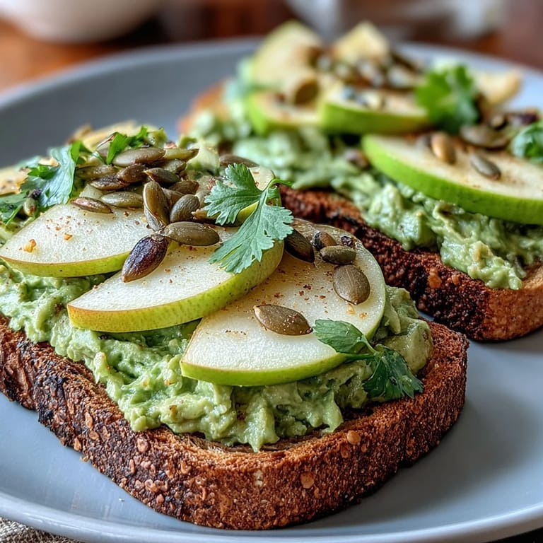 Save to Pinterest There's something about the contrast of warm toast meeting cold, creamy avocado that just makes mornings feel intentional. I discovered this combination on a Tuesday when I had exactly three things in my kitchen—bread, an avocado, and a handful of pumpkin seeds left over from a salad experiment. The green apple came later, almost by accident, but it changed everything. That snap of tartness against the buttery avocado felt like biting into something that actually tastes like breakfast should taste, not just filling.