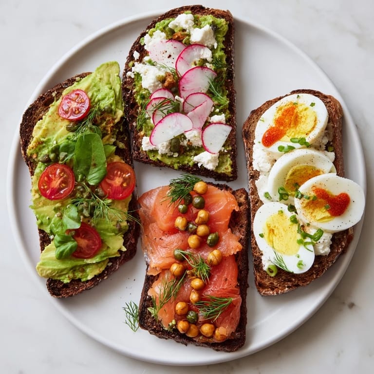 - Prepare each toast with its unique topping For Classic Tomato & Basil: Top with halved cherry tomatoes, crumbled feta, and fresh basil For Smoked Salmon & Dill: Spread a thin layer of cream cheese, add smoked salmon, sprinkle with capers and dill For Spicy Chickpea & Radish: Toss chickpeas with olive oil and paprika, spoon over toast, and top with radish slices For Egg & Sriracha: Layer with egg slices, drizzle with sriracha, and sprinkle with chives