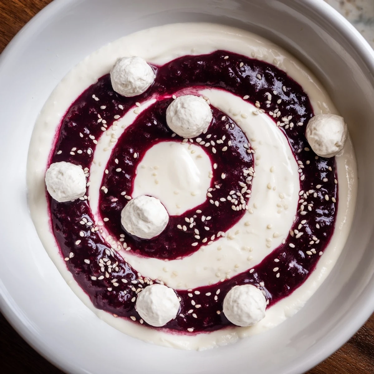 There's something about a dessert that doesn't require an oven or a recipe with twenty steps. This one sits somewhere between a snack and a proper dessert, refined enough for a dinner party but casual enough to make on a Tuesday afternoon when you want something that feels a little luxurious. The textures—creamy yogurt, tart goat cheese, jammy-sweet swirls, and toasted sesame crunch—all play together without any single element overwhelming the others.