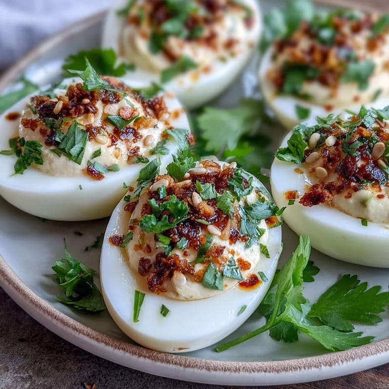 Save to Pinterest There's something irresistible about the humble deviled egg. That classic combination of creamy yolk filling nestled in a firm white cradle has been gracing appetizer platters for generations. But these aren't your grandmother's deviled eggs. This recipe takes the beloved classic and transforms it with a bold Asian-inspired twist that will wake up your taste buds and leave guests reaching for seconds. The creamy, tangy filling provides the perfect canvas for the star of the show: a sizzling chili garlic oil topping that delivers waves of heat, texture, and complex umami flavor in every bite.