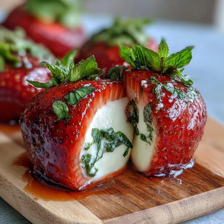 Save to Pinterest My neighbor knocked on the kitchen window one June afternoon, holding a basket of strawberries still warm from the farmer's market, and asked if I could help her figure out what to do with them before they softened. I had just been thinking about caprese, that simple Italian pairing of tomato, mozzarella, and basil, and something clicked—why not swap the tomatoes for these jewel-bright berries? By the time we'd threaded the first skewer together, she was already planning to bring them to her book club that evening. It became one of those dishes that feels both elegant and effortless, the kind that makes people pause and ask for the recipe before they've even taken a bite.