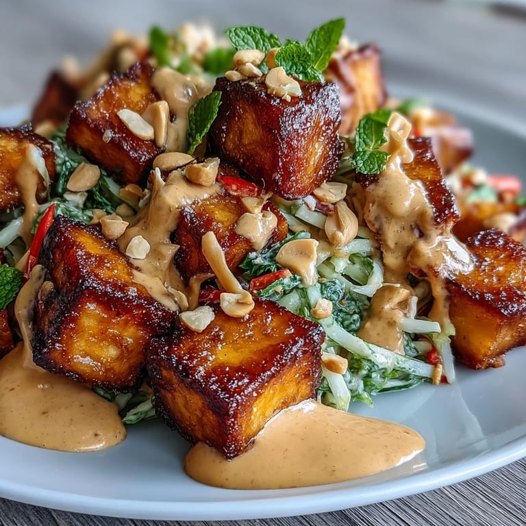 - Lay out the salad on plates, scatter over the crispy tofu, and drizzle with that luscious peanut sauce. Finish with chopped peanuts for crunch—it looks as joyful as it tastes.