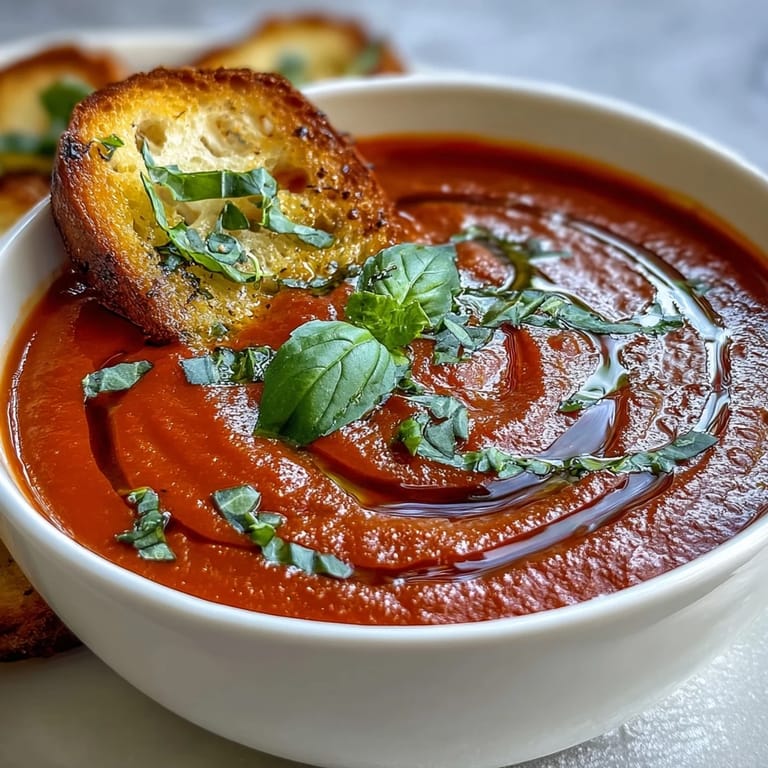 Save to Pinterest There's something about the smell of tomatoes hitting hot garlic that makes you feel like you're cooking with intention. I discovered this soup on a gray afternoon when my kitchen felt too quiet, and I needed something that would wrap around me like a blanket. The coconut milk was a last-minute swap for cream I didn't have, and it turned out to be exactly right—silky without being heavy, letting the basil shine through like it's been waiting all along to be noticed.